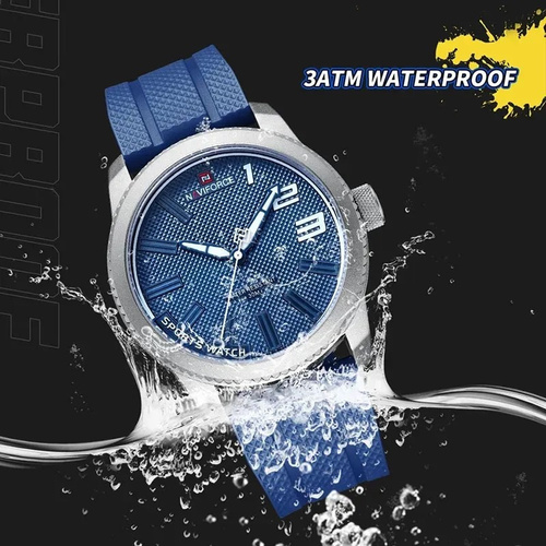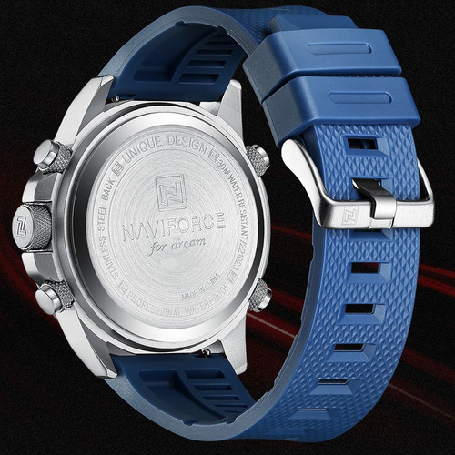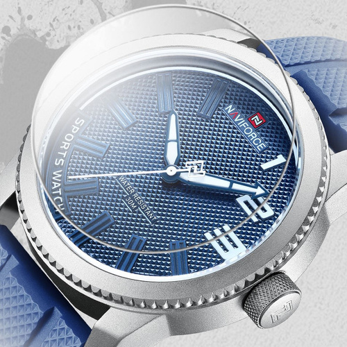 این یک ساعت اسپرت مردانه از برند ناویفورس (Naviforce) است – NF9202 swbe در رنگبندی آبی جذاب (Blue Dial) با قاب نقرهای، صفحه آبی تیره با جزئیات رومی و بند سیلیکونی آبی نرم.